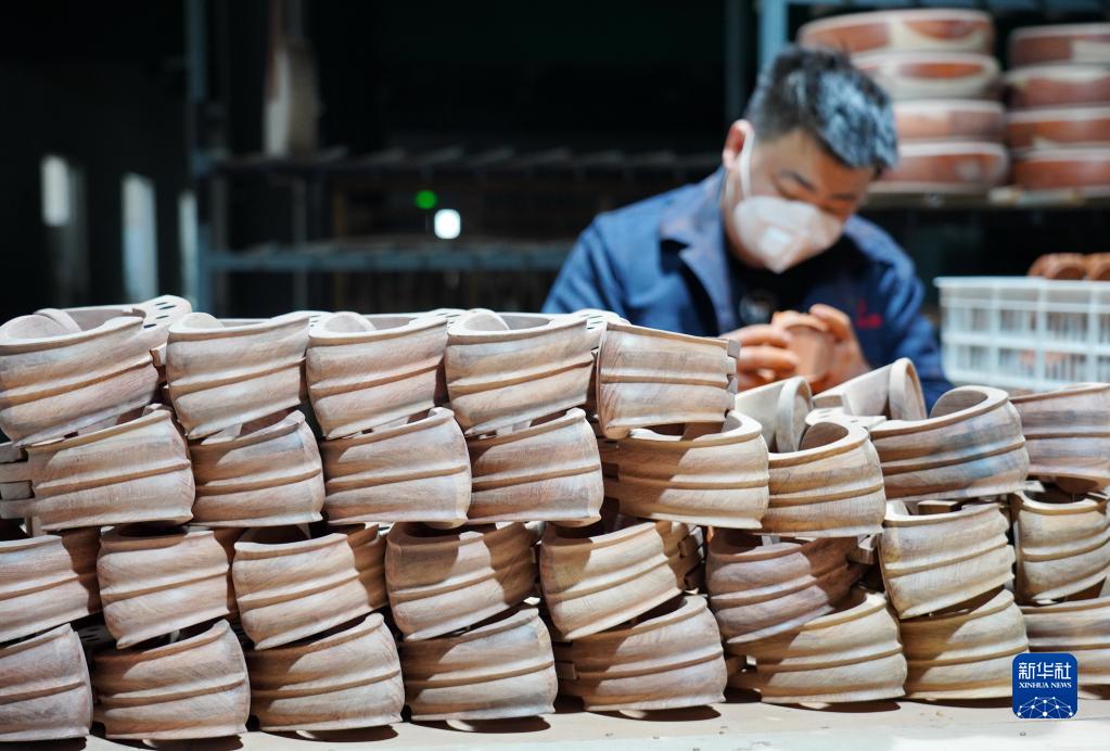 2月18日,河北省肃宁县一家民族乐器生产企业的工人在生产车间内制作乐器部件。
