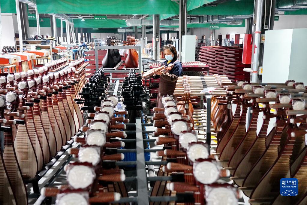 2月18日,河北省肃宁县一家民族乐器生产企业的工人在生产车间内整理乐器。