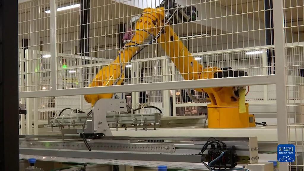 在晶澳(邢台)太阳能有限公司组件车间,机器人正在处理太阳能板。新华社记者邹尚伯 摄