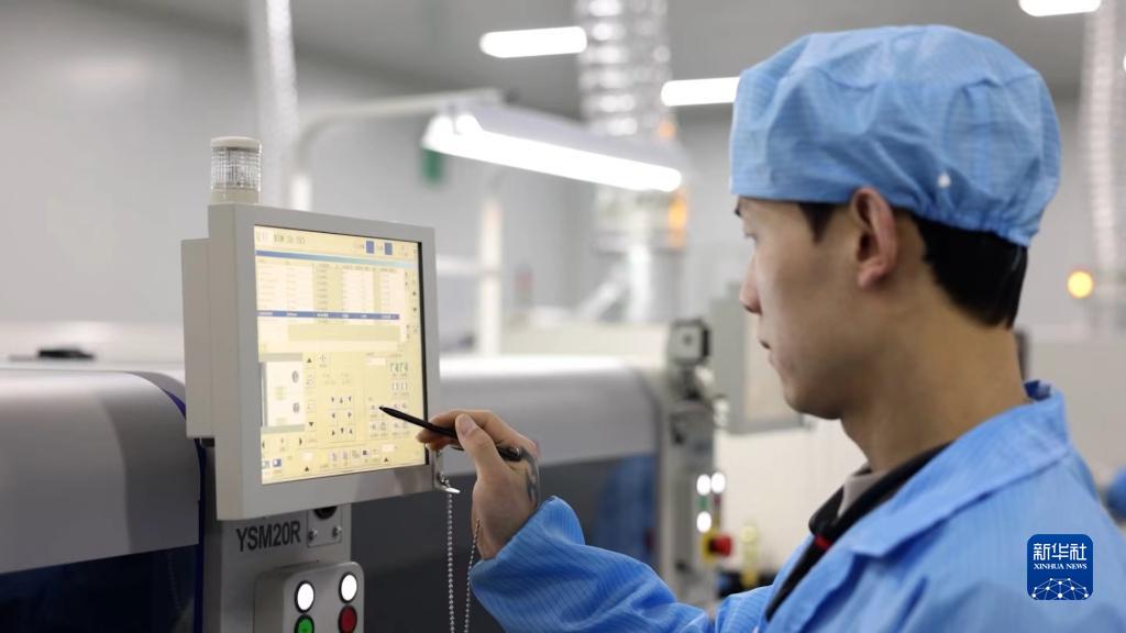 在河北科昕电子科技有限公司生产车间里,工人正在屏幕前操作数字化生产线。新华社记者邹尚伯 摄
