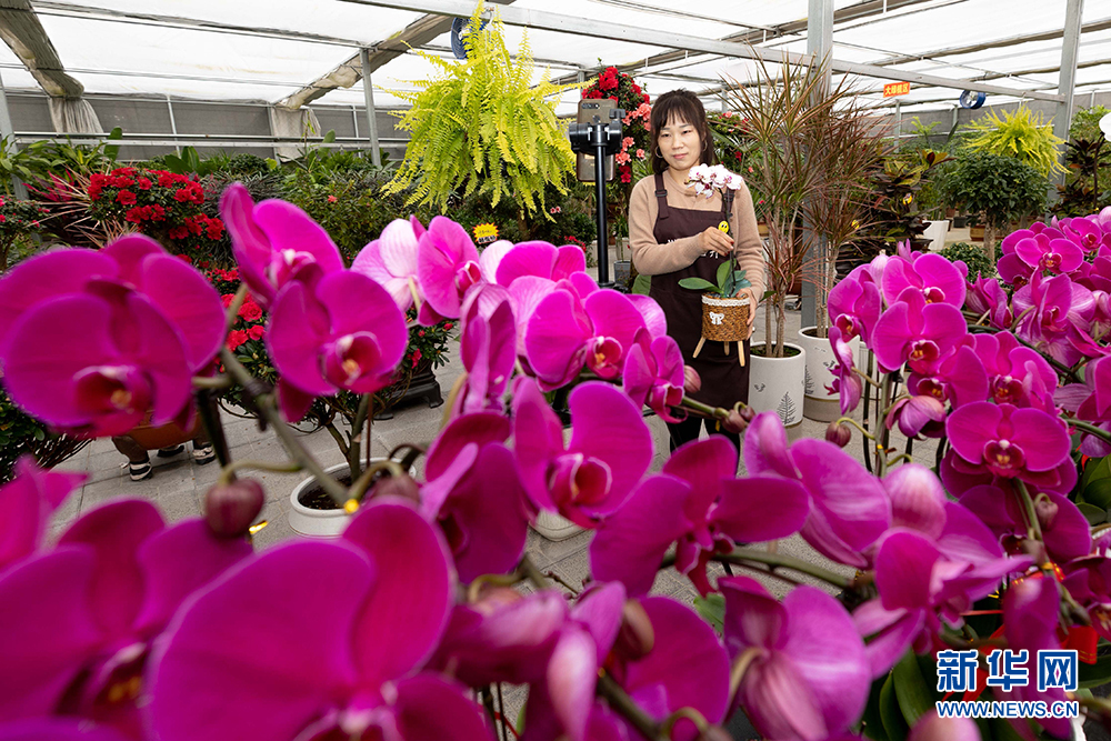 为提高花卉经济效益,小士庄村花卉基地工作人员线上直播带货,拓展花卉销售渠道。新华网发 杨帆摄