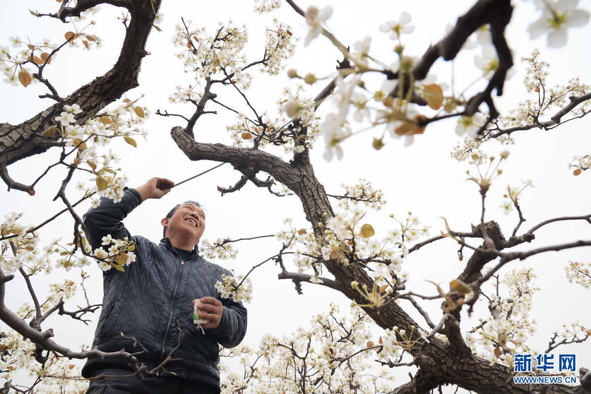 在魏县董河下村生态梨园,梨农正忙着给梨花授粉。新华网发 蒿群英摄