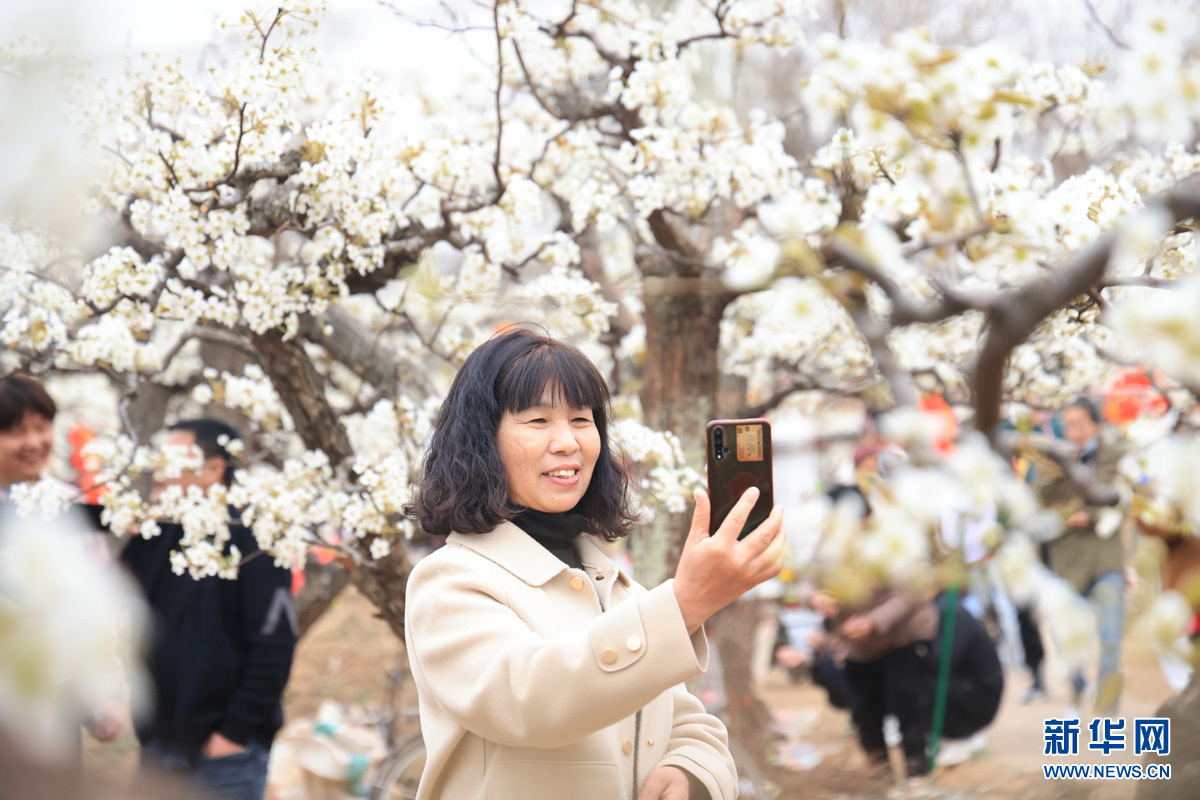 游客在魏县董河下村生态梨园内拍照留念。新华网发 蒿群英摄