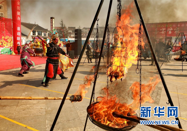 演出时,“武将”在木凳上对打,代表骑马打仗,场下角落的火堆代表战火。观众还可以和演员互动,穿上戏服、举着火把,跟着“兵将”沿着火堆跑,俗称“跑跑阵,一年顺”。