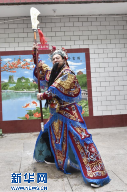 他边唱边做着各种动作,神情专注、招式干净利索,完全沉浸在戏曲角色中。