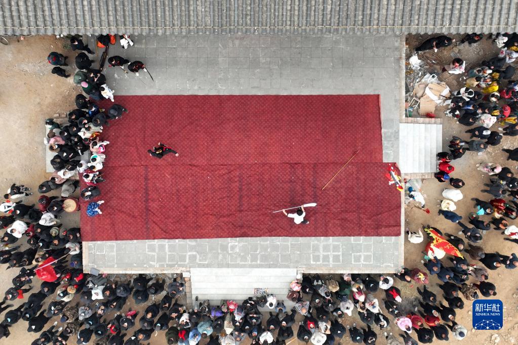 1月26日,梅花拳爱好者在平乡县油召乡八辛庄村进行梅花拳器械对练(无人机照片)。