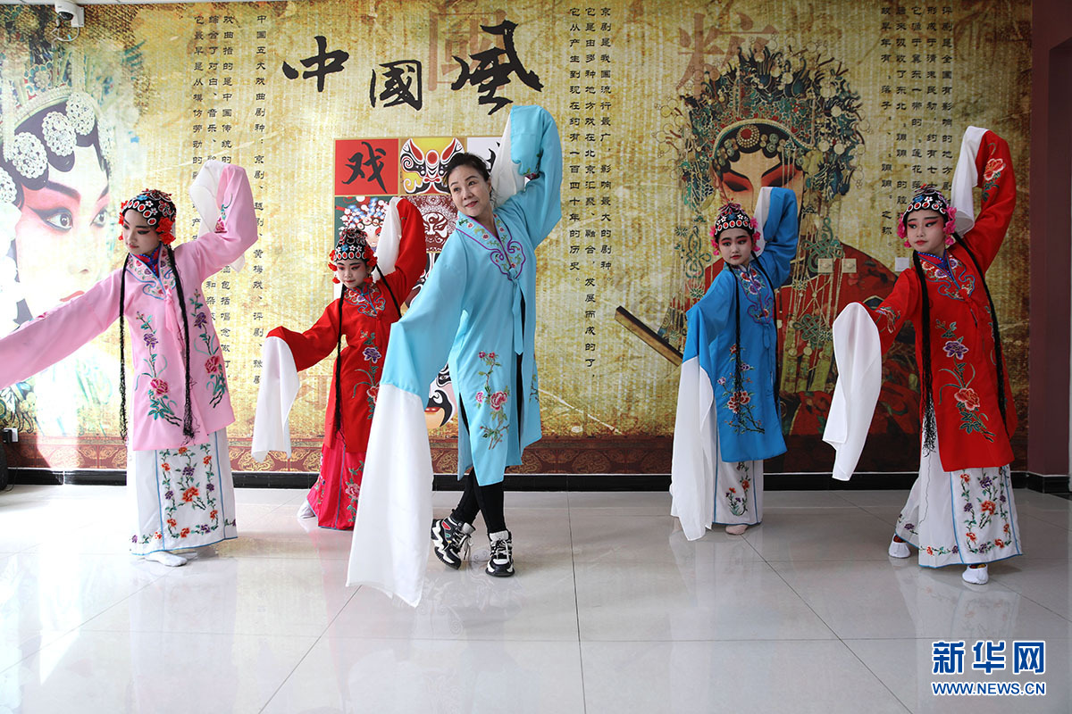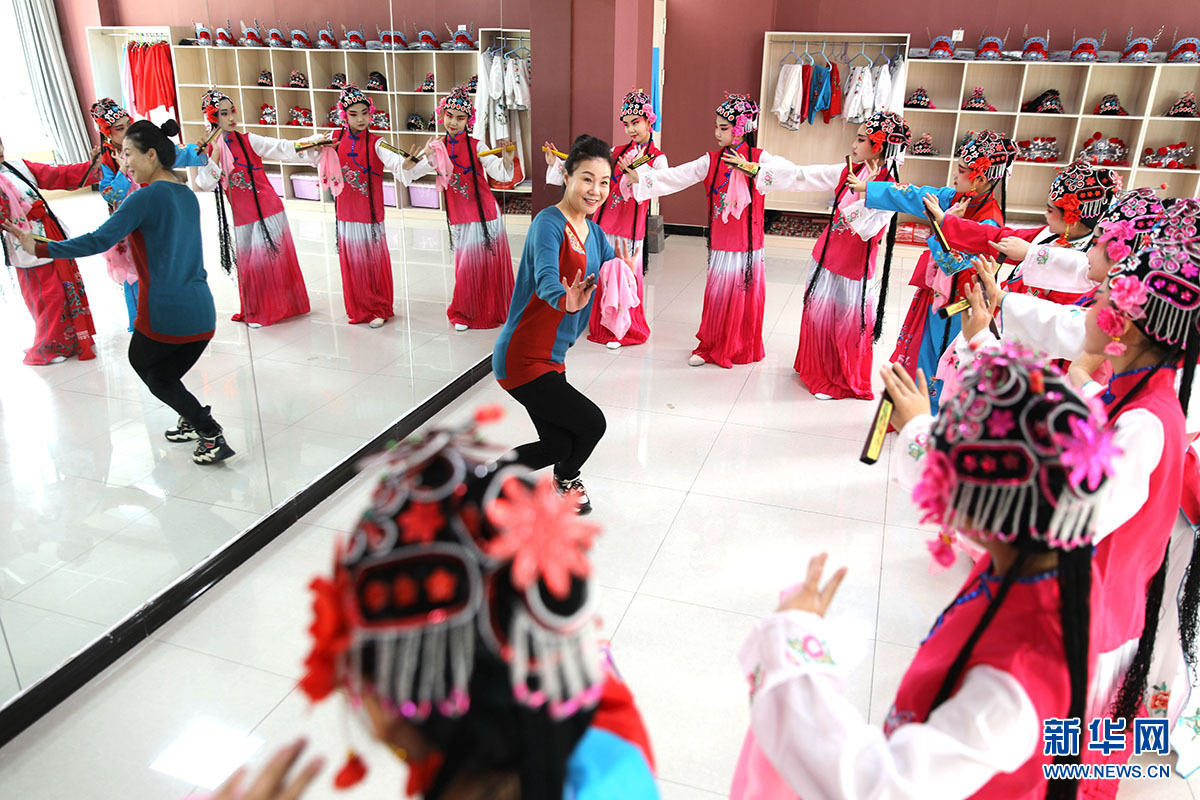 3月28日,在宽城满族自治县第三小学戏曲课堂上,老师为学生进行动作示范。新华网发 刘环宇摄