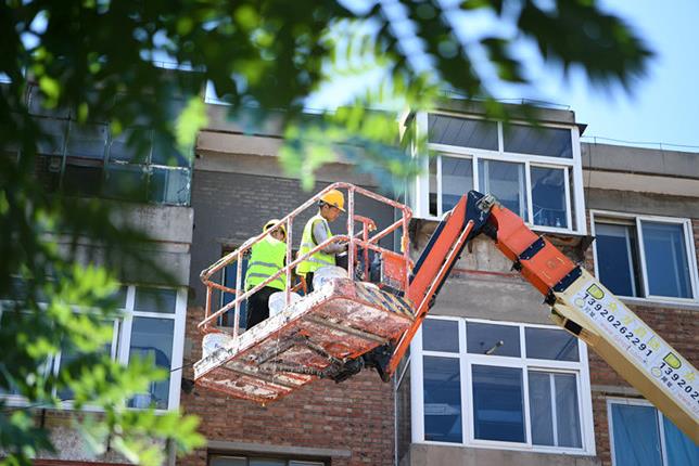 在廊坊市老旧小区改造现场,工人们为墙体涂抹抗裂砂浆。 人民网 林福盛摄