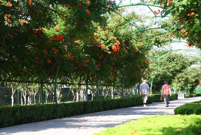 迎着夏日晨曦,在邢台市建设路“口袋公园”吟春园,晨练的市民可以观赏到盛开的凌霄花,并感受着浓浓绿意。