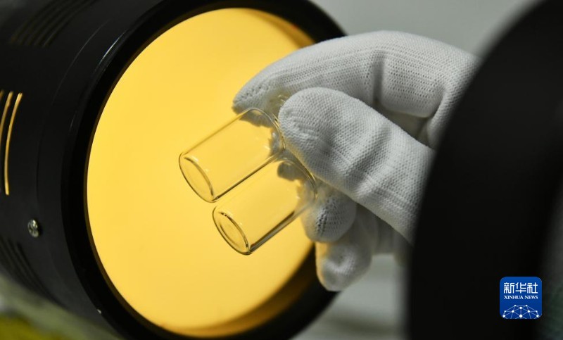 2022年5月24日,工人在沧县一家药包材企业的药用中性硼硅玻璃管制瓶车间对产品做应力检测。新华社发(苑立伟 摄)