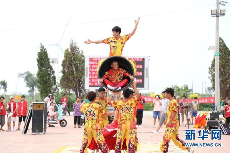 演员在沧县旧州镇东关村文化广场表演传统杂技。新华网发 田博 摄