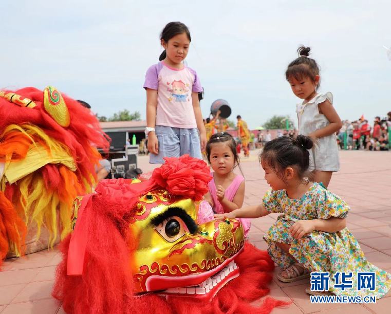 演员休息时,几个小观众好奇地抚摸“狮子头”道具。新华网发 田博 摄