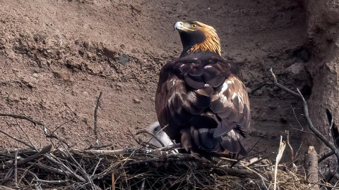 近日,鸟类摄影师赵玉红在河北省张家口市赤城县拍摄到国家一级保护野生动物金雕育雏的影像。